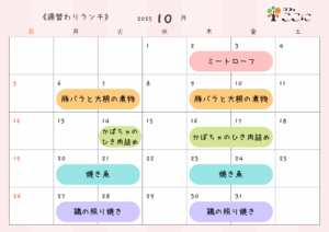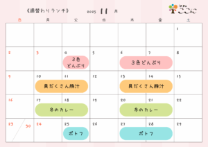 11月の週替わりランチは、第2週:3色どんぶり第3週:具だくさん豚汁第4週:冬のカレー第5週:ポトフとなってお… 続きを読む: 11月の週替わりランチ - 10月の週替わりランチ