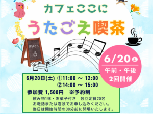 いつもカフェここに をご利用いただきましてありがとうございます。誠に勝手ながら、4月7日(火)は終日貸切とさせ… 続きを読む: 貸切営業のお知らせ - サークル環花〈5月〉