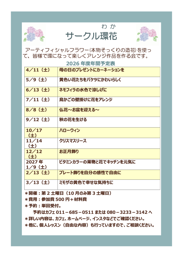 2026-03-07 / 最終更新日時 : 2026-03-07 mitashoko お知らせ サークル環花 2026年度 年間予定表 サークル環花の年間予定表です。サークルという名前にはなっていますが、1回からのご参加が可能です。ぜひ ご一緒に楽しくアレンジ作品を作ってみませんか?