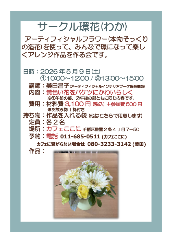 2026-03-07 / 最終更新日時 : 2026-03-07 mitashoko お知らせ サークル環花〈5月〉 5月のサークル環花のご案内です。春にぴったりな明るくてかわいらしい作品を作ってみませんか?ご参加心よりお待ちしております。